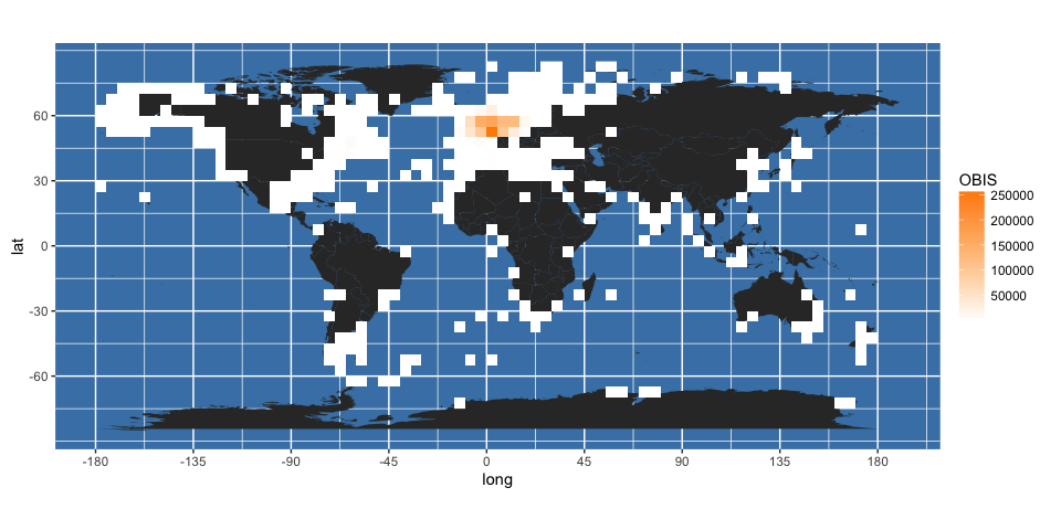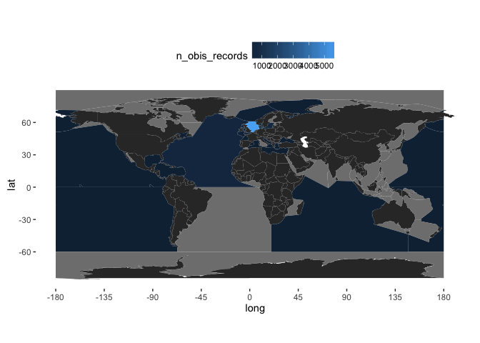 Note that for our rather small sample, there will probably be a number of regions with no OBIS records or species here. But the principle is sound.