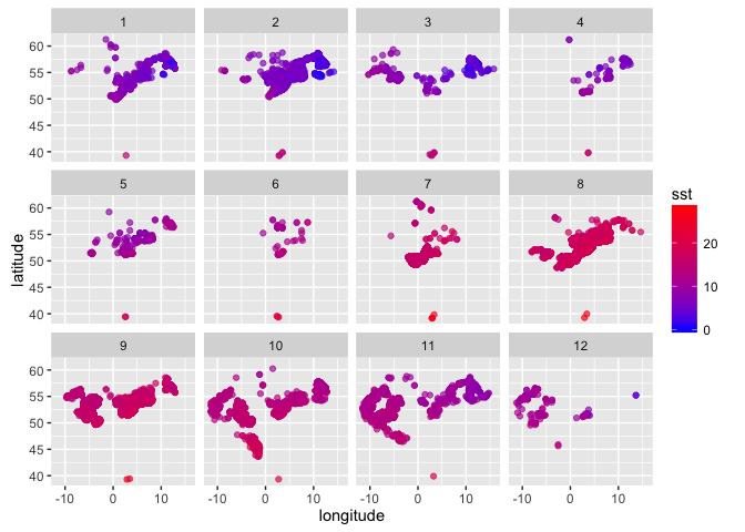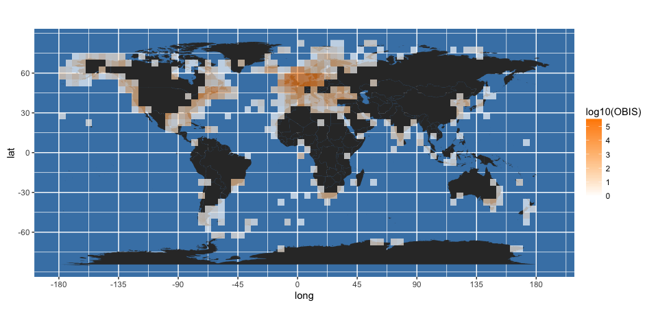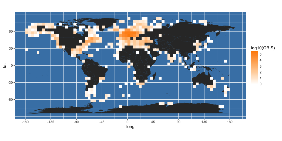 Polygons defined in this way (providing they are not too complex) can then be fed into OBIS queries. (For more complex polygons it is probably easier to query OBIS with a simple bounding box and then crop the returned occurrences to your polygon within R). For instance, to get a list of fish species occurring in water of 1000m or more depth in the North Atlantic (note, the depth constraint here is bottom depth, not sample depth). These queries can take a long time to run if polygons are large and/or complex, or if the taxonomic group queried is speciose. The mammal query here takes around 1.5 minutes for me to run: