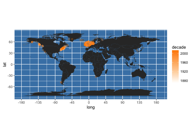 OBIS uses the WoRMS standard taxonomy. This means that names within OBIS’s realisation of the WoRMS Aphia database will be matched correctly - that is, occurrence records returned for an accepted taxonomic name will include records for unaccepted synonyms, and unaccepted names will be amalgamated to the current accepted name. However, it is often worthwhile to check your taxonomy in advance, especially if you are working with large sets of taxa (as macroecologists frequently are), or with unusual sets of names, such as the Sorby Collection. This will help to identify any potential problems or ambiguities, and also gives more flexibility for identifying and dealing with minor typos and misspellings. WoRMS provides options for matching relatively small lists of taxa (<1500 rows) via its website, with larger matches possible via the LifeWatch taxonomic backbone. For large and/or complex lists of taxa, for instance if you have little confidence in the names supplied, then working via WoRMS or LifeWatch in this way is probably a good idea. Certainly in our experience any sufficiently long list of taxa is going to require a certain amount of user interaction and informed or expert judgement in order to arrive at an acceptable taxonomic match. However, it is possible to rapidly match names to WoRMS by calling the WoRMS web services directly from within R, using the taxizesoap package. This provides much of the WoRMS taxon matching functionality, for instance fuzzy (or approximate) name matching is possible. This can provide a convenient, scripted way of generating a taxonomically robust dataset, and we demonstrate its use here.