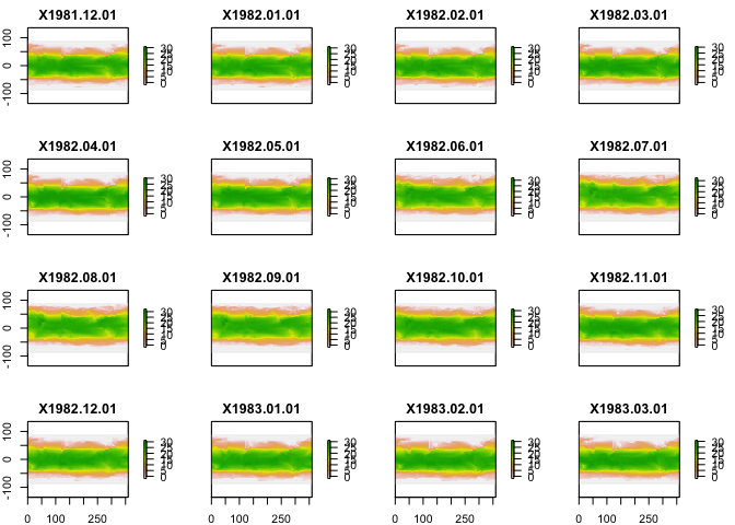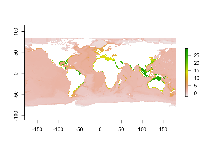 Of course you can also use this method of finding ‘environmentally suitable areas’ directly on gridded data (in raster format), e.g. to find those areas globally with a bottom temperature >15 degrees: