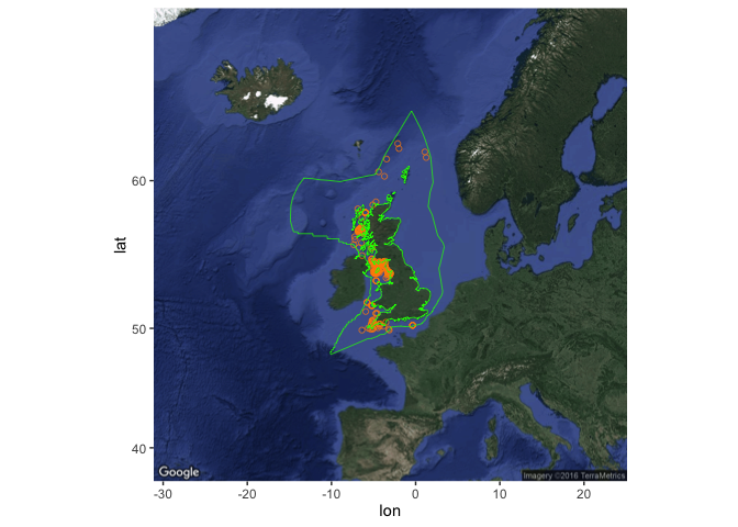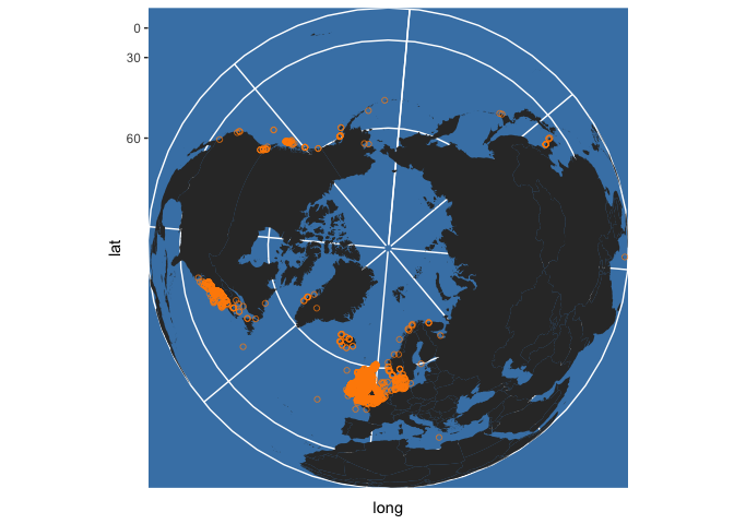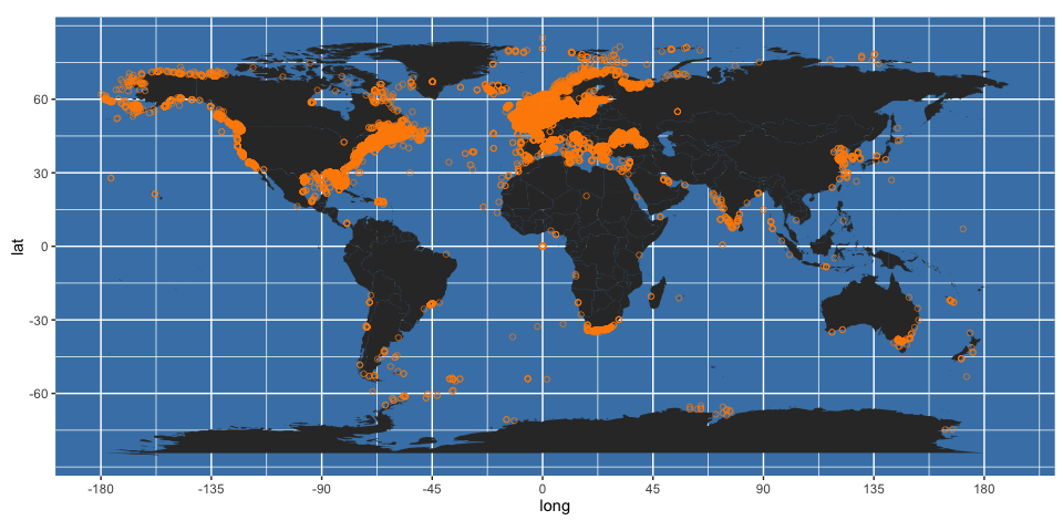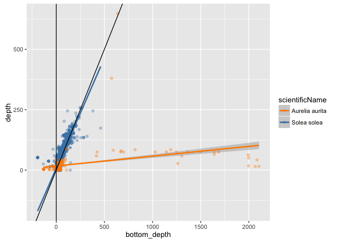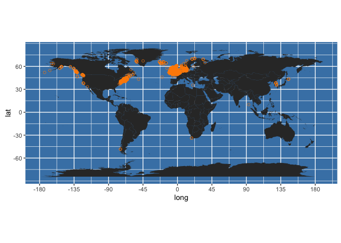 Polygons defined in this way (providing they are not too complex) can then be fed into OBIS queries. (For more complex polygons it is probably easier to query OBIS with a simple bounding box and then crop the returned occurrences to your polygon within R). For instance, to get a list of fish species occurring in water of 1000m or more depth in the North Atlantic (note, the depth constraint here is bottom depth, not sample depth). These queries can take a long time to run if polygons are large and/or complex, or if the taxonomic group queried is speciose. The mammal query here takes around 1.5 minutes for me to run: