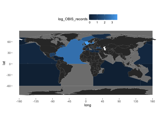 Note that for our rather small sample, there will probably be a number of regions with no OBIS records or species here. But the principle is sound.