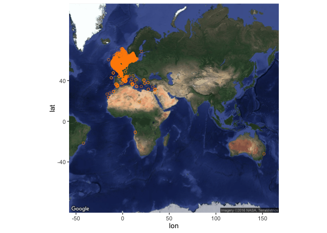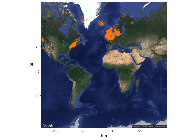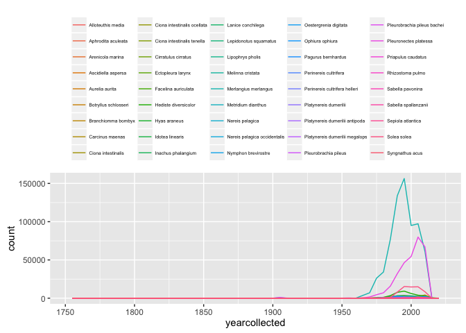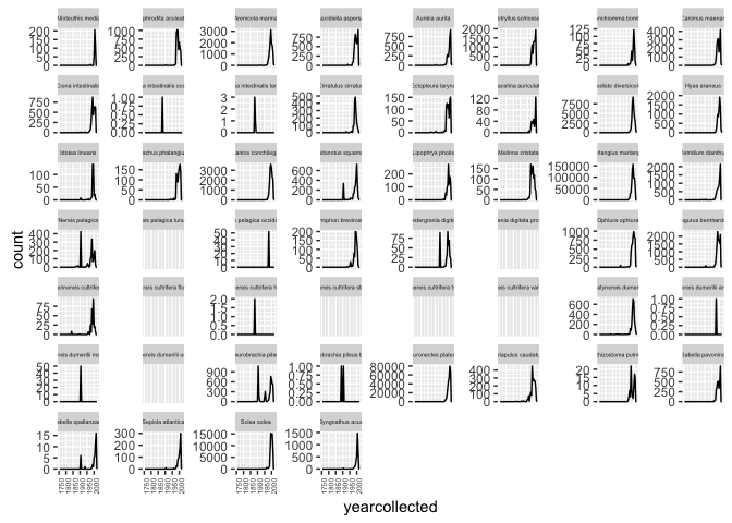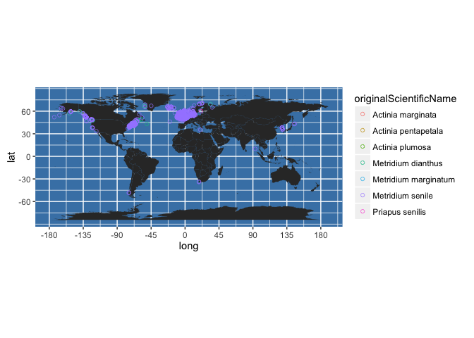 OBIS uses the WoRMS standard taxonomy. This means that names within OBIS’s realisation of the WoRMS Aphia database will be matched correctly - that is, occurrence records returned for an accepted taxonomic name will include records for unaccepted synonyms, and unaccepted names will be amalgamated to the current accepted name. However, it is often worthwhile to check your taxonomy in advance, especially if you are working with large sets of taxa (as macroecologists frequently are), or with unusual sets of names, such as the Sorby Collection. This will help to identify any potential problems or ambiguities, and also gives more flexibility for identifying and dealing with minor typos and misspellings. WoRMS provides options for matching relatively small lists of taxa (<1500 rows) via its website, with larger matches possible via the LifeWatch taxonomic backbone. For large and/or complex lists of taxa, for instance if you have little confidence in the names supplied, then working via WoRMS or LifeWatch in this way is probably a good idea. Certainly in our experience any sufficiently long list of taxa is going to require a certain amount of user interaction and informed or expert judgement in order to arrive at an acceptable taxonomic match. However, it is possible to rapidly match names to WoRMS by calling the WoRMS web services directly from within R, using the taxizesoap package. This provides much of the WoRMS taxon matching functionality, for instance fuzzy (or approximate) name matching is possible. This can provide a convenient, scripted way of generating a taxonomically robust dataset, and we demonstrate its use here.