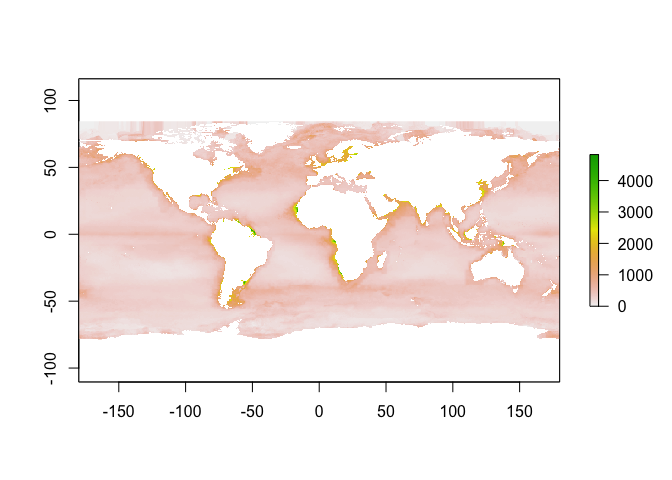 Of course you can also use this method of finding ‘environmentally suitable areas’ directly on gridded data (in raster format), e.g. to find those areas globally with a bottom temperature >15 degrees: