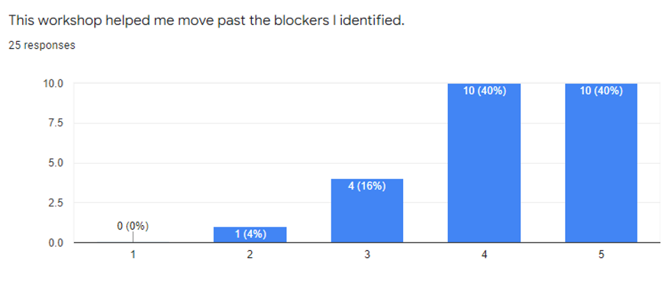 While our workshop was a bit unconventional, participants said it worked well and that the format gave them flexibility in meeting their needs. From respondents to our post-workshop survey, 80% said the workshop helped them move past the blockers they had identified.
